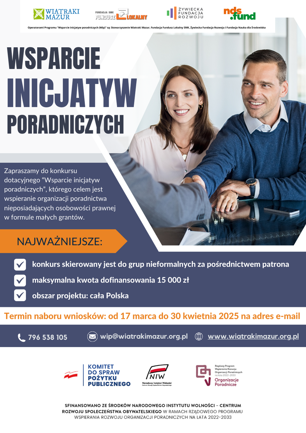 Stowarzyszenie „Wiatraki Mazur”, Fundacja Fundusz Lokalny SMK, Żywiecka Fundację Rozwoju i Fundacja Nauka dla Środowiska, zaprasza do udziału w konkursie grantowym „Wsparcie inicjatyw poradniczych”.